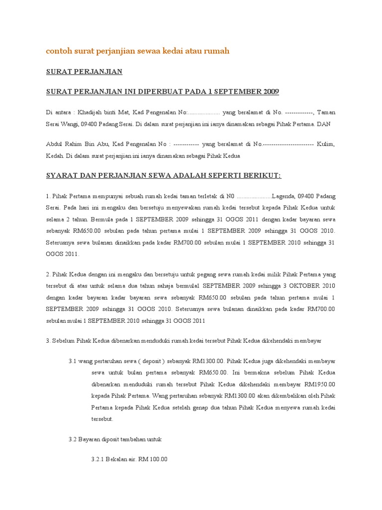 Contoh Surat Perjanjian Sewa Kedai Atau Rumah Pdf